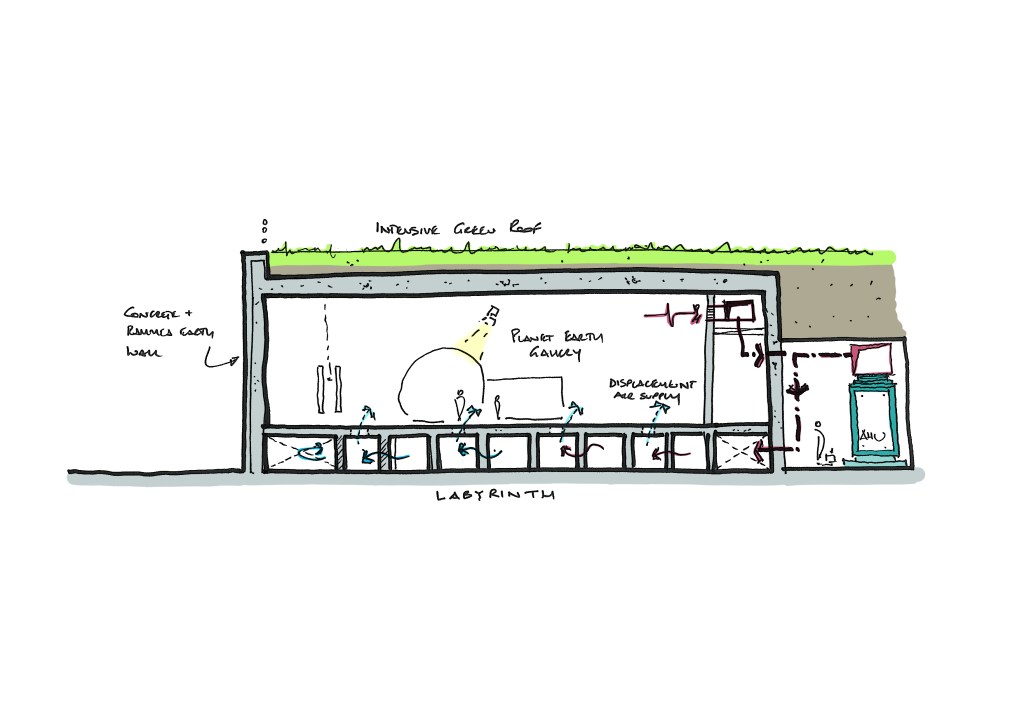 Earth Centre with a green roof and basement labyrinth for cooling. Image credit: Atelier Ten