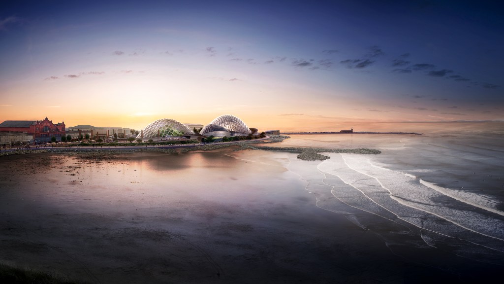 The Eden Project in Morecambe, is inspired by the nature of Morecambe Bay, particularly by mussels and how their very thin shells can span long distances to protect and help the organism inside to thrive. Grimshaw Architects together with Eden Project and Schlaich Bergermann Partners - SBP (Structural Engineers) developed the design idea of an envelope capable of spanning structurally significant distances to fulfil not only clients' sustainability and experiential requirements but also to safeguard future changes within the building. This inspiration led to superstructures made of timber with varying opacity levels to suit different design needs, from immersive experiences to planted human environments which intend to get visitors closer to nature through natural rhythms.